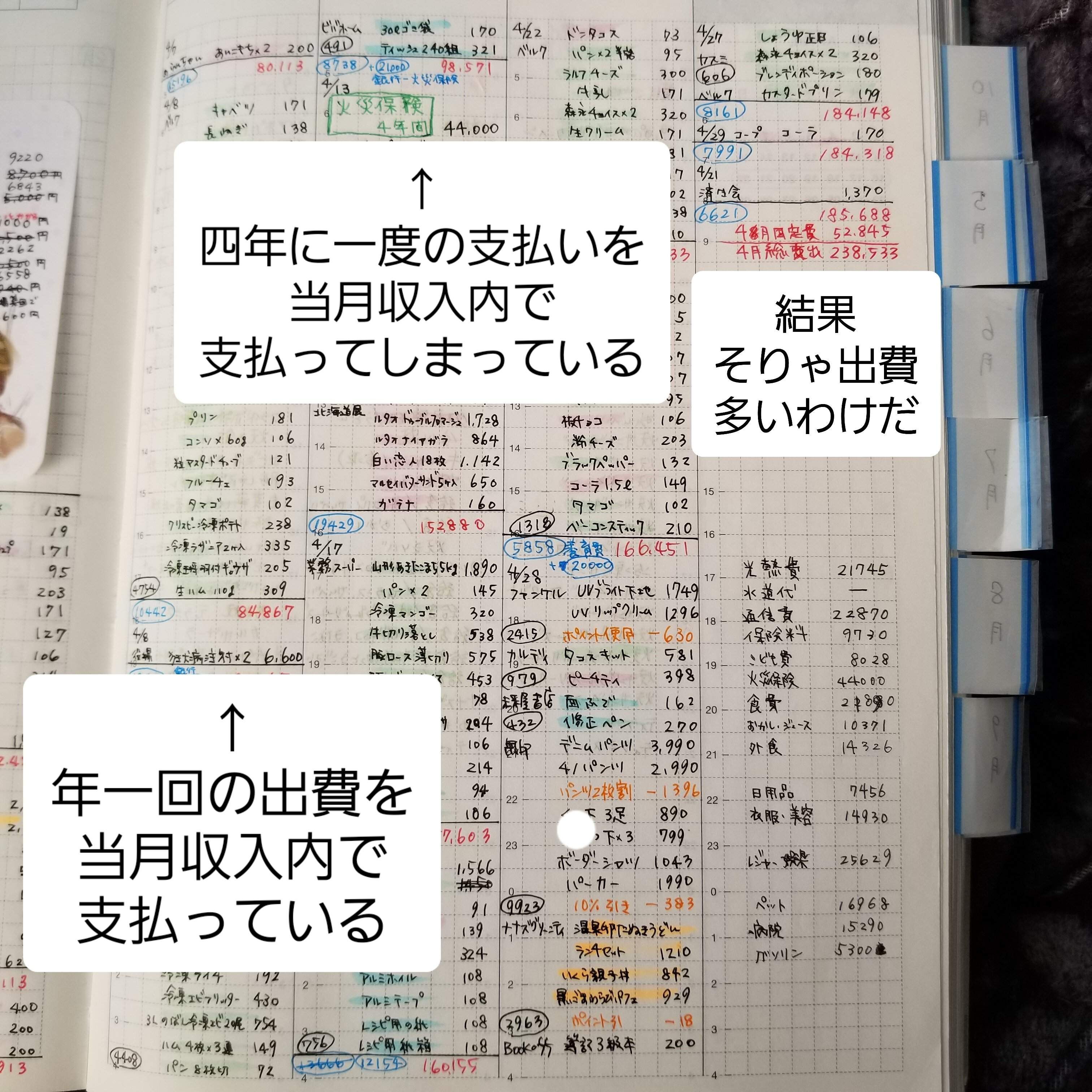 また、4年に1度の保険料だろうが、1年に1度の税金やワクチン接種にかかる費用だろうが、その月に支払うものはその月の出費として計上していたため、月によって出費が大幅に違い不安定な家計簿です。
