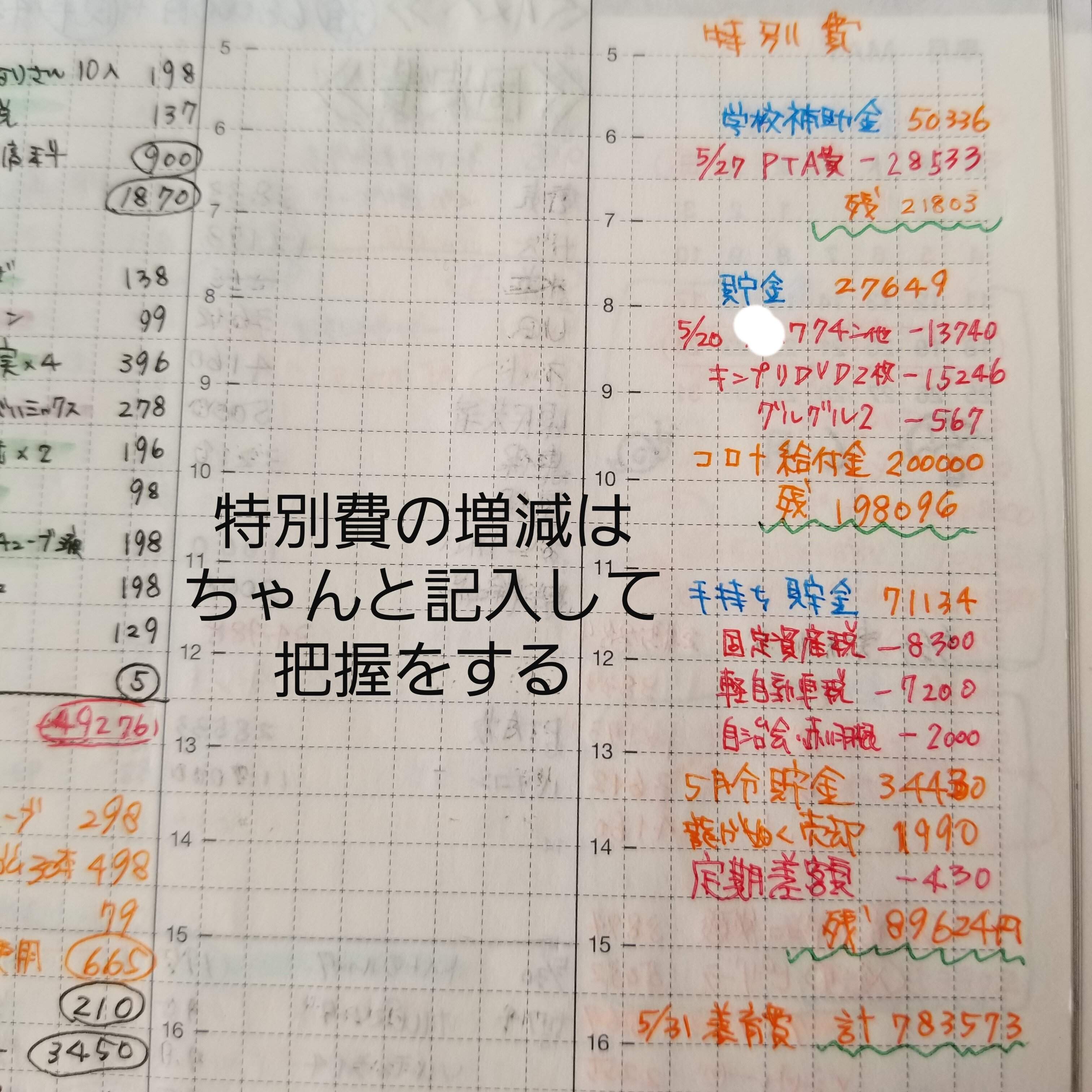 勿論、特別費から出しているだけでは、いつの間にかなくなってしまう可能性もあるので、特別費分も毎月ちゃんと家計簿に記入しています。