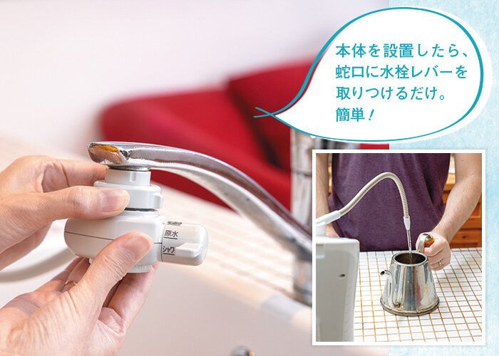胃腸症状の改善が期待できるアルカリイオン水が水道水から気軽に作れるうえ、地球にやさしい点にも、2人は大満足の様子です。「取りつけがすごく簡単なのもいいですね。毎日使う水だから、カラダのことを考えて、エコにもつながる物を選びたい私たちにうれしいアイテムです」(聡子さん、ペオさん)