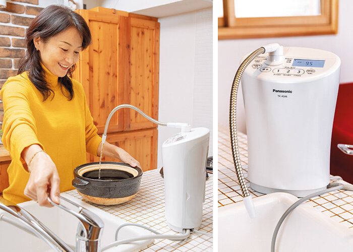 聡子さんは、アルカリイオン水を毎日のお料理にも活用。「手間をかけずに、すぐにアルカリイオン水を料理に使えるのがいいですね。キッチンになじむシンプルなデザインも気に入ってます」(聡子さん)。段差や継ぎ目が少ないデザインで、お手入れも簡単です。