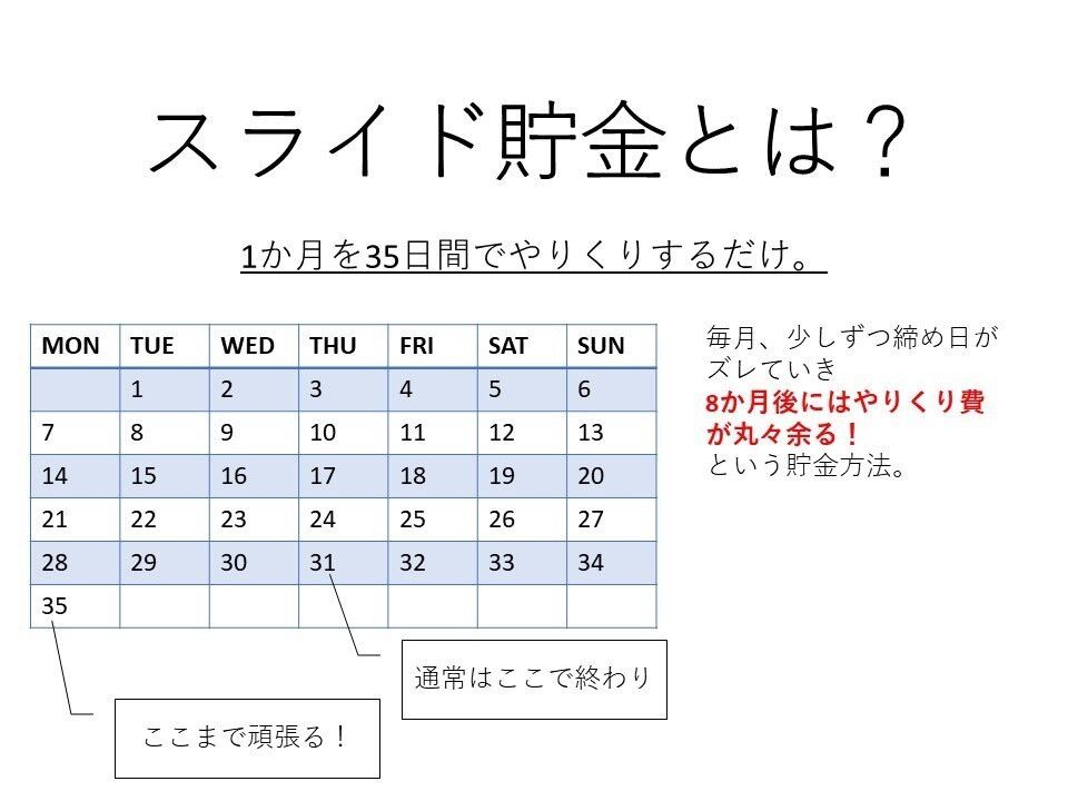 やり方はとってもシンプル!やりくり日数を35日間に設定するだけ。スライド貯金とはその名の通り「35日間でやりくりをしていくことで締め日が毎月少しずつズレていき、8カ月後にはやりくり費がまるまる余る」という貯金術です。わが家のやりくり費は5万円なので、それがまるまる余る月が出てきます。これがボーナスとなるわけです。