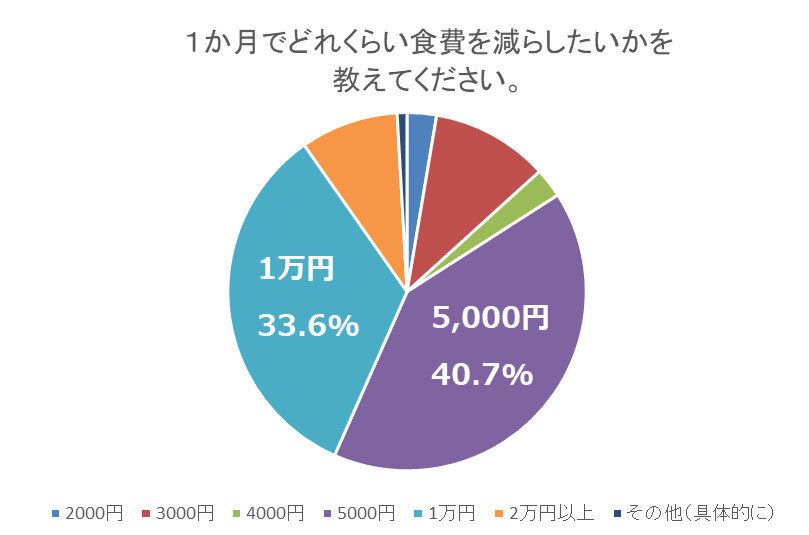 食費を減らしたいという人に、1カ月で食費をどれくらい減らしたいか聞いたところ、いちばん多かったのは「5,000円」の40.7%、次に「1万円」の33.6%が続きました。