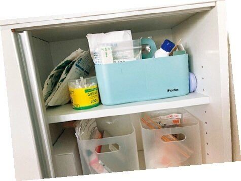 薬なら、水がいるのみ薬はキッチンで、塗り薬は洗面所やダイニングで保管するのがおすすめ。どこでだれが使うかを考えて置き場所を決めてから、種類別に分けて収納するのが、探し物を減らすコツ。