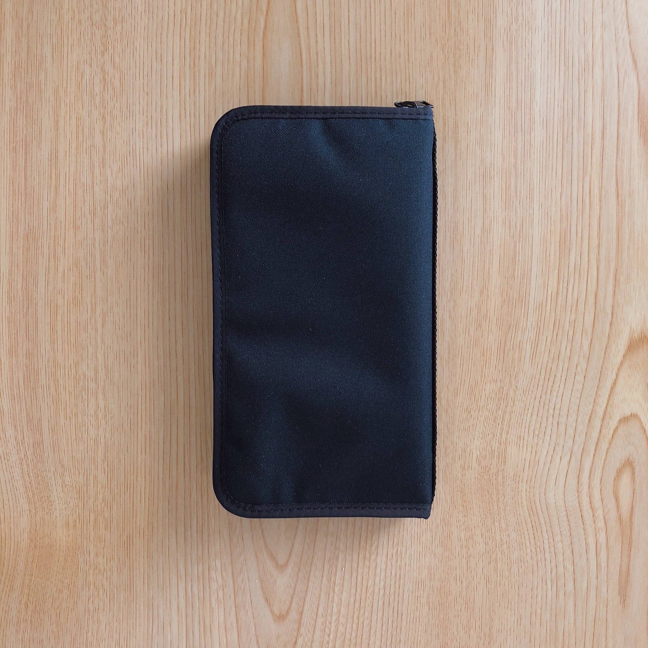 商品名は「ポリエステルパスポートケース・クリアポケット付 」。価格は1,990円(税込)で、約23.5×13×2.5cmと、一般的な長財布より少し大きいくらいのサイズです。写真のブラックのほかに、ネイビーとグレーがあります。