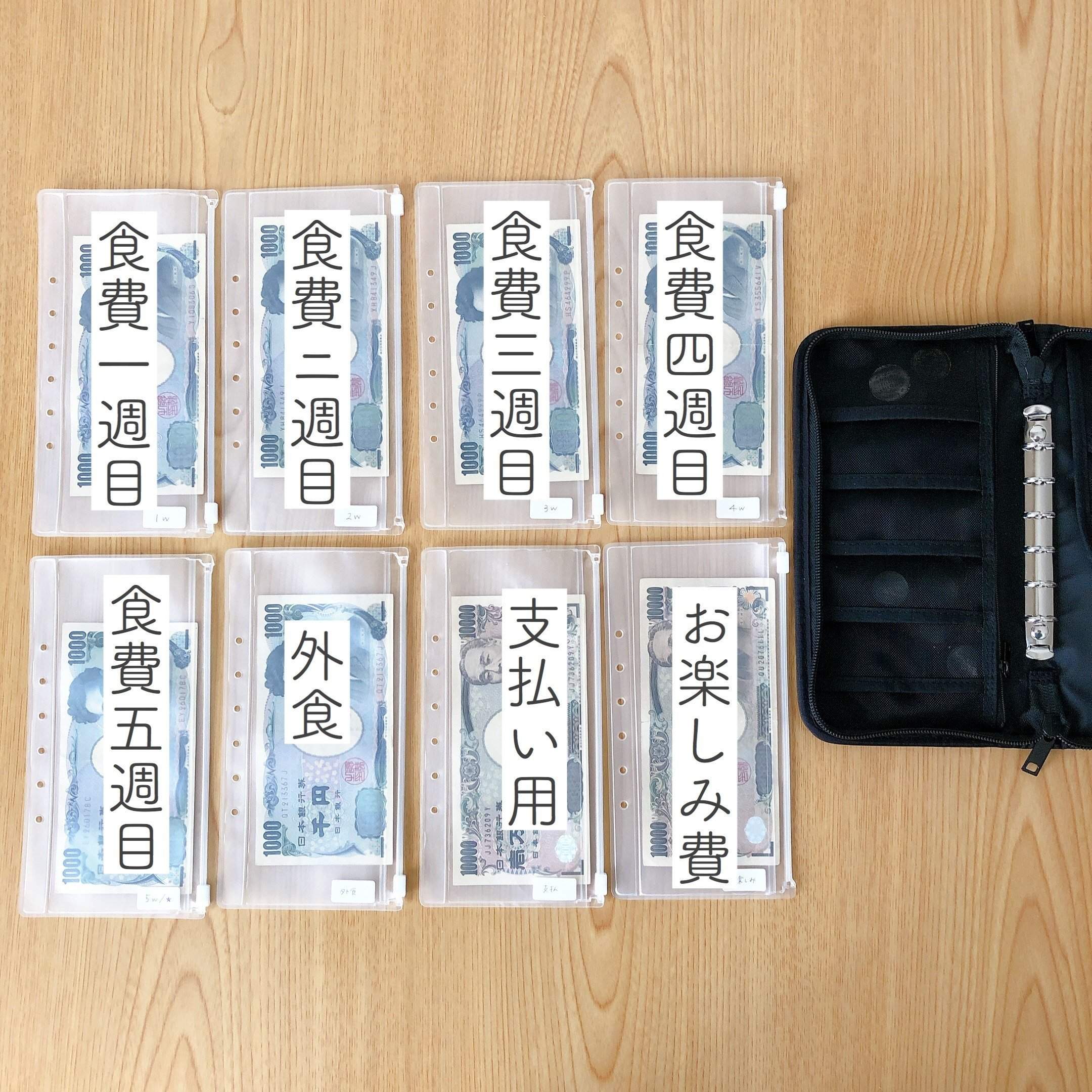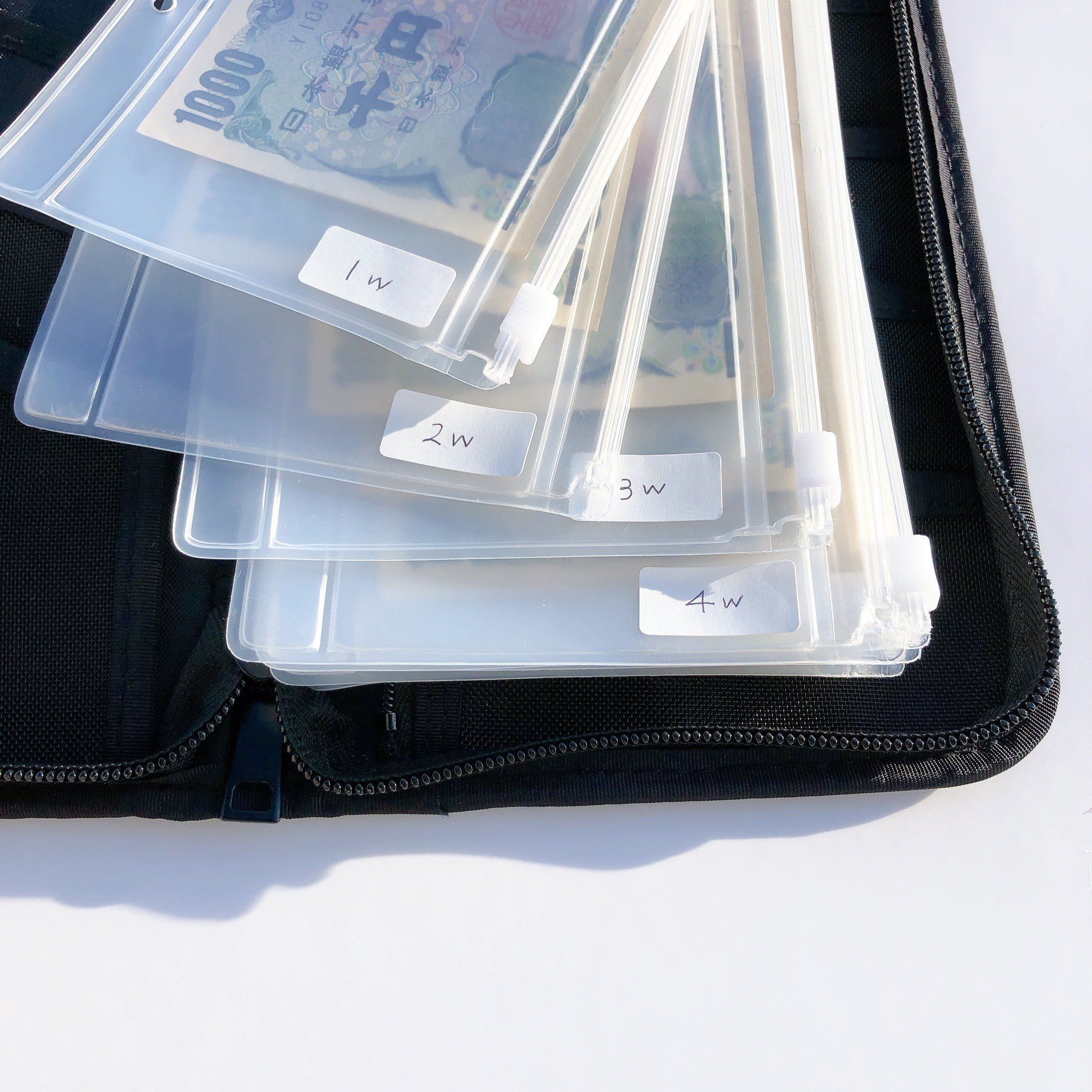 リフィルにラベルを貼って、月に一度、予算のお金を振り分けて「このポーチの中のお金だけで生活する」と決めて過ごします。