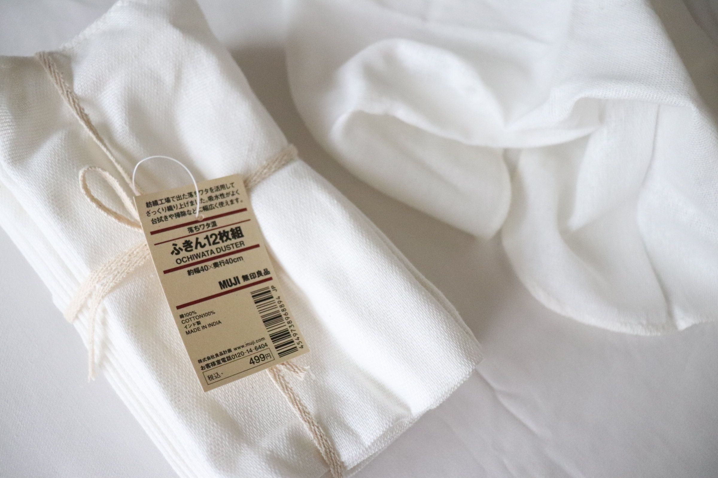 デッシュクロスとして活躍してくれる無印良品の「落ちワタ混 ふきん12枚組」。12枚入りで499円(税込)とコスパもいいところが魅力的。消耗品だからこそ無印良品週間にゲットしておきたい定番アイテムです。