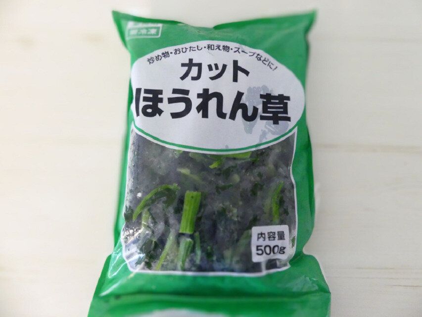 続いては冷凍庫の在庫が減ってきたら必ず購入するカットほうれん草です。おひたしから、バター炒め、ナムルなどの副菜からカレーやシチューなどの野菜など幅広いメニューに使える万能選手。