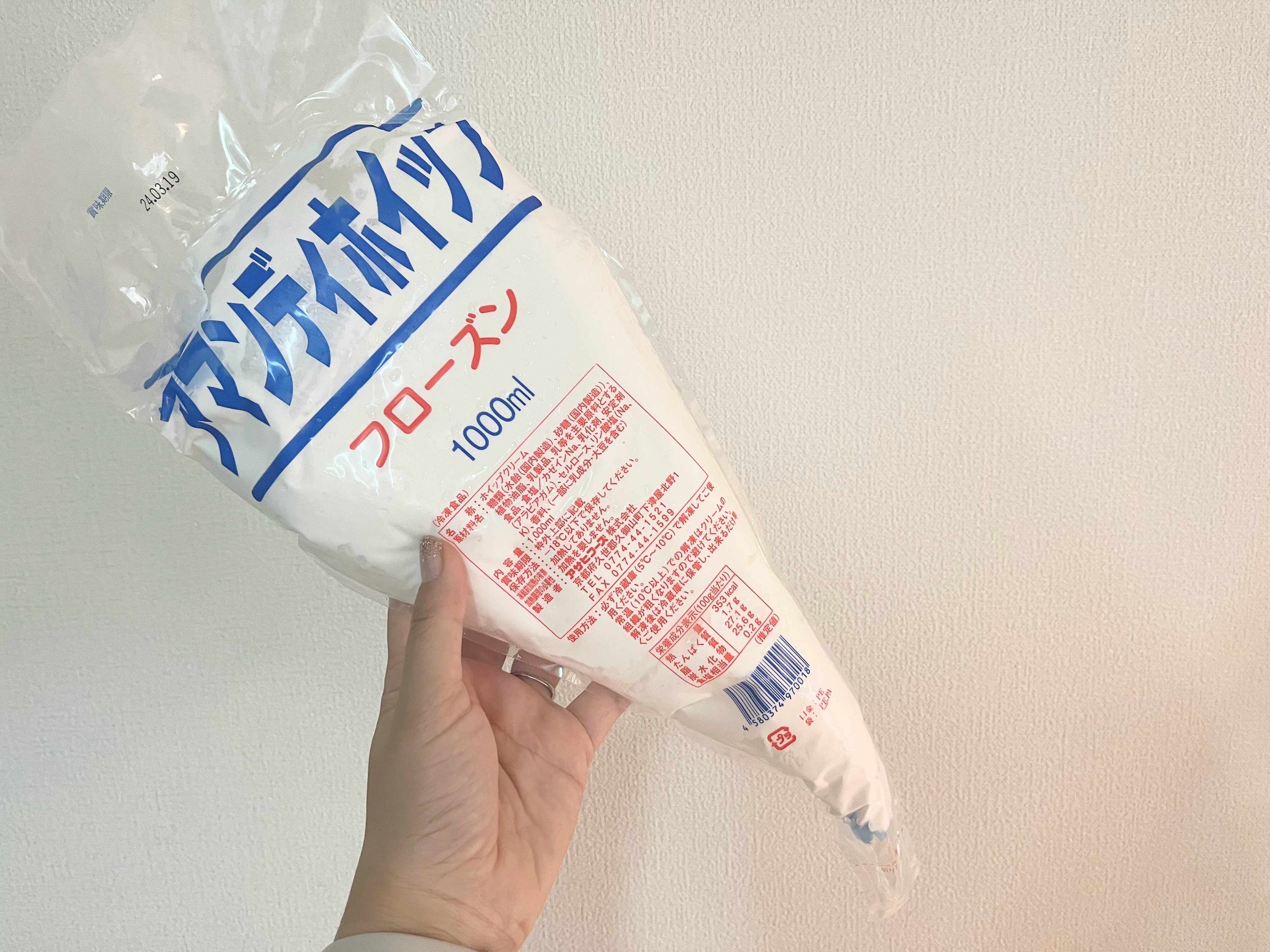 最後にご紹介するのは、ストックがなくなりそうになったらかごに入れているのがこちらのホイップクリーム。たっぷり1000ml入っている超コスパの良い、業務スーパーで大人気の商品です。一度に食べきれないので食べる量だけ解凍して楽しんでいます。