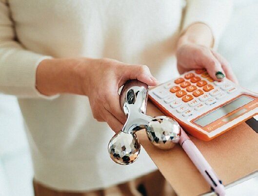 家計簿をつけたら、「ReFa」のローラーで顔をマッサージしながら、予算の残金を確認。家計管理と自分磨きを同時にこなします。