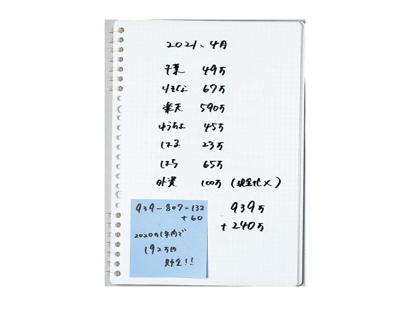 半年ごとに現時点でのわが家の総貯蓄額を書き出します。「半年でいくら増えたか、金額がわかるとやりがいがあります。夫にも見せてやりくりの成果を共有」。