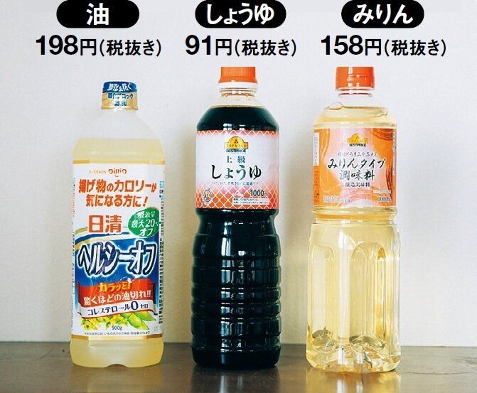 「イオンのみりん風調味料は、料理の味がちゃんとしまっておいしい。油は、安心のメーカー品を地域底値のドンキで買います」。