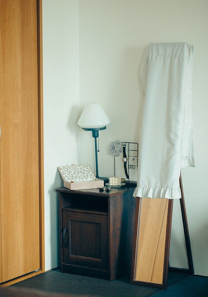 買う基準は”安いから”ではなく”欲しい物”。「姿見のカバーは実は100均のカフェカーテン。理想的な色だったので、自分でリメイクしました」。