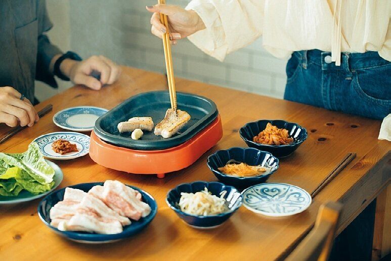 「豚バラブロックは分厚く切って焼き、コチュジャンとごま油を混ぜたみそで。玉ねぎのマリネやキムチを添えても1人約200円♪」。