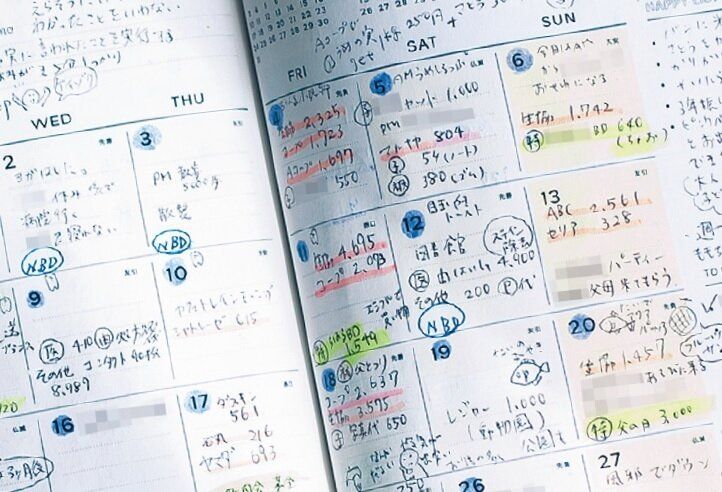 『サンキュ!』の付録の手帳を活用。お金を使った日に店名、金額を記入し、ピンクのマーカーを。「ひと目で支出がわかるので、使いすぎをセーブできるように」。
