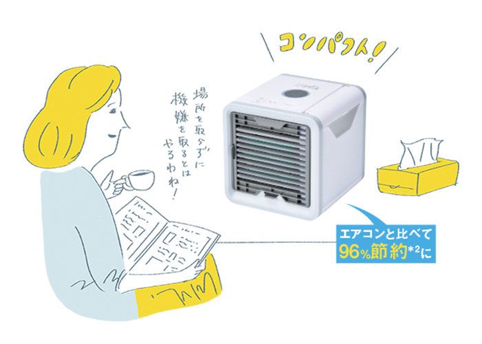 今年は電気代をどうにかしたいな~と思っているところに見つけたのが卓上パーソナルクーラー「ここひえ」。こちら、水分を含んだフィルターを通して風が吹き出すので、扇風機より高機能! 扇風機と比べると最大で13度も低い風が出てくるとのこと。気になる電気代は、エアコンと比べると96%(※2)も安いとのこと。