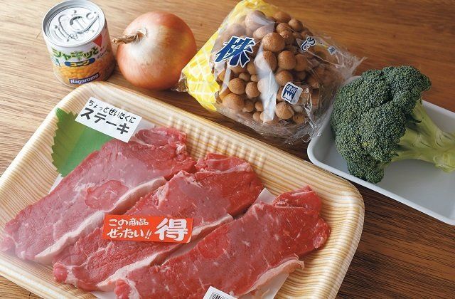 「肉をたっぷり食べると食費が増える」というのは大間違い。主菜にコストがかかる日は、副菜でバランスを取ればいいんです!例えば、ステーキ屋さんの肉プレート。つけ合わせがシンプルでも、満足度は高いですよね。少ない肉をカバーしようとあれこれ食材を使うより、ボリューム肉&シンプル副菜が正解です!