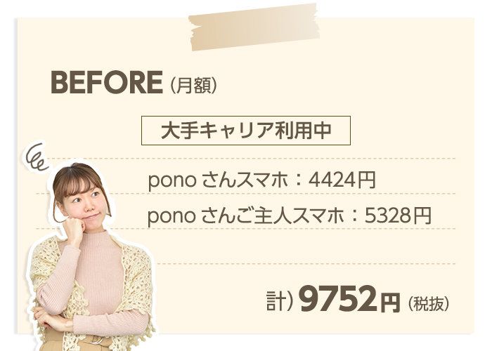 現在は夫婦2人で大手キャリアを利用中というサンキュ!ブロガーのponoさん。毎月のスマホ代は、2人合わせて月々約1万円。契約時によく適用される割引キャンペーンが終了する2年ごとにキャリアを乗り換えながら、コツコツと通信費を節約しているのだとか。格安SIMや通信会社のプランに多少の知識はあるものの、種類がありすぎてイマイチ決め手にかけるのがお悩みだそう。