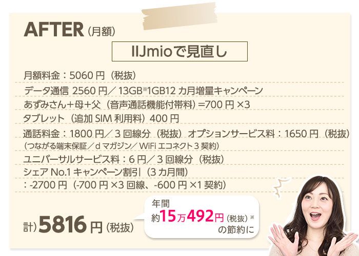 なんと、IIJmio「みおふぉん」に乗り換えた場合の年間の通信費総額のシミュレーション結果が大手キャリアの約24万4500円に対し、IIJmio「みおふぉん」なら約9万4000円となり、年間で約15万500円の節約になることが判明!(※2) びっくりしすぎて「これなら家族旅行ができちゃう!」とその場で言ってしまいました(笑)。