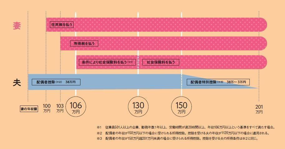 「150万円までなら、夫の手取りが減らないのね」と思いがちですが、実は世帯の手取り収入に影響大なのは「社会保険の壁」。これは妻の年収がある金額を超えて、自分で社会保険料を払うかどうかの分岐点のこと。
