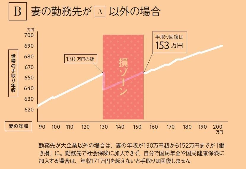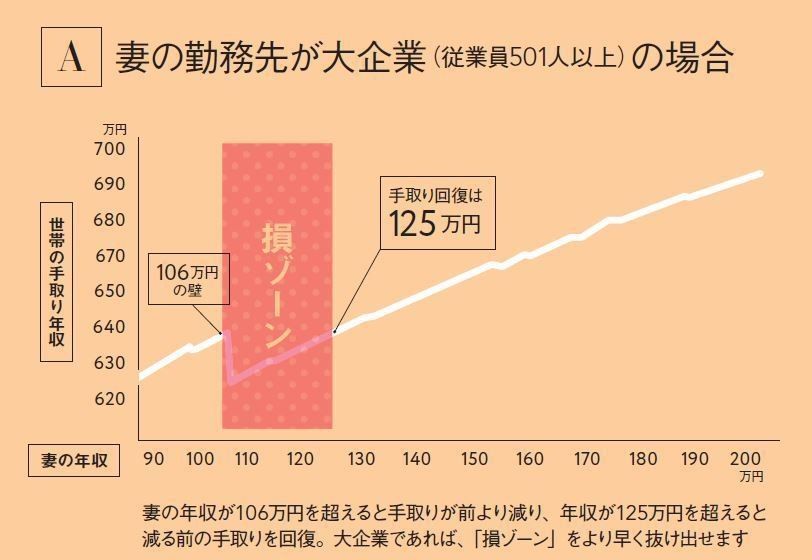 例えば、妻の勤務先が、従業員501人以上の大企業であれば年収106万円超で、従業員500人以下なら年収130万円超で、社会保険料の支払いが発生します。保険料が天引きされる分、「給料は上がったのに手取りが減る」という働き損に。でも、年収がある金額を超えれば手取りが回復し、昇給するに従って手取り収入もアップ!大企業のほうが「損ゾーン」を早く抜け出すことができます。