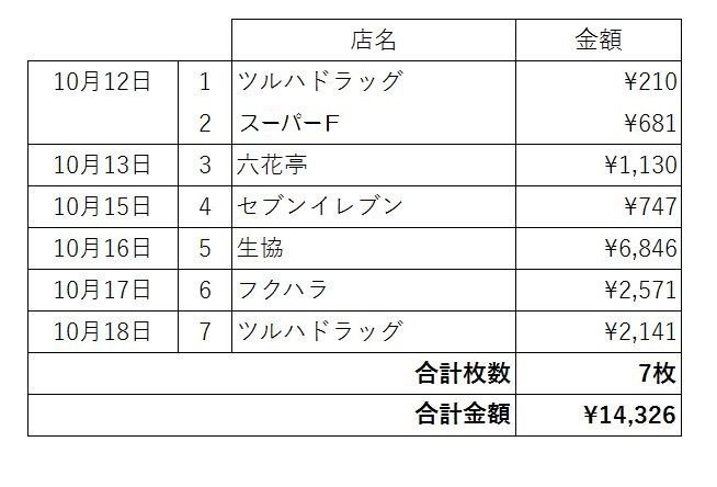 大上:宅配を除くと、いちばん金額が大きいのは10月17日「スーパーF」での買い物ですね。この日は、まとめ買いの日でしたか?