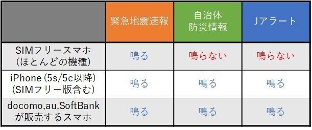 ここ数年は、日本でのSIMフリースマホのサービスが本格化し、ここ半年ぐらいで発売された、Android8.0以降のスマホなら緊急地震速報に対応しています。ただ、古いスマホの中には対応していない機種もあるので、その場合は信号を受信しても、画面に表示されない、警告音が鳴らないというケースが発生するそうです。緊急警報は、緊急地震速報のほかにも、「Jアラート」や、台風や水害などに対応した「自治体防災情報」などがあります。