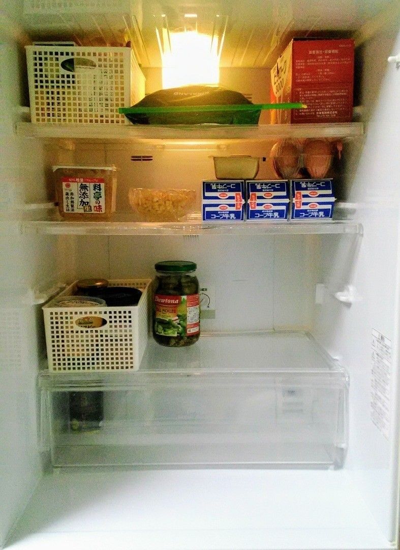 冷蔵庫をカラッポにしてからまとめ買いに行く堀江麻衣さん。食材を無駄にしないために、冷蔵庫はなるべくガラガラに整理し、冷凍庫はジッパー付きポリ袋で小分け保存した肉や魚類をギッシリ詰めています。冷蔵庫内を広く使えるだけでなく、節電効果も期待できるかも!冷蔵庫の下の段を1段外し、ダイソーのカゴを使って整理しているのもポイントです。