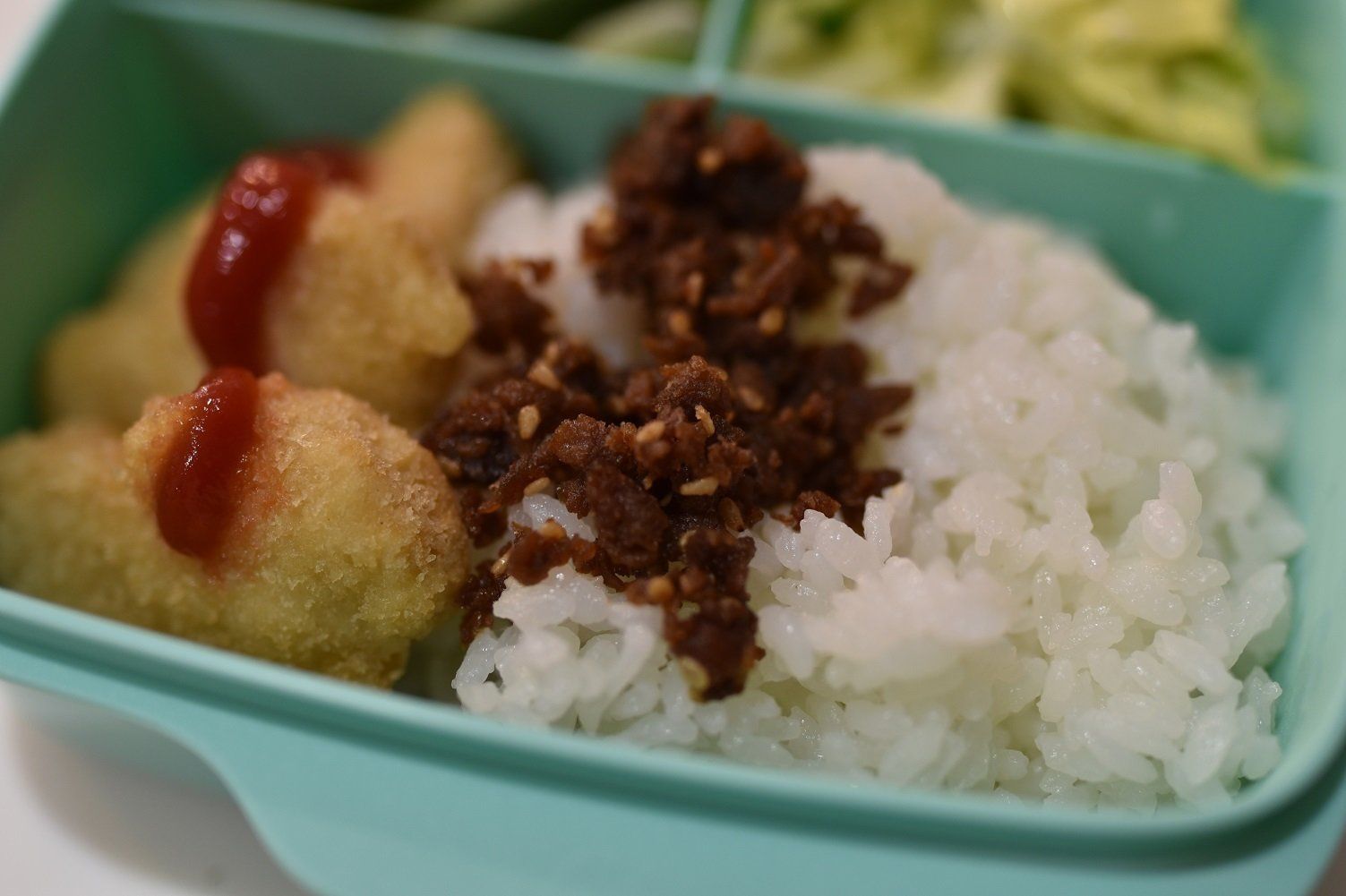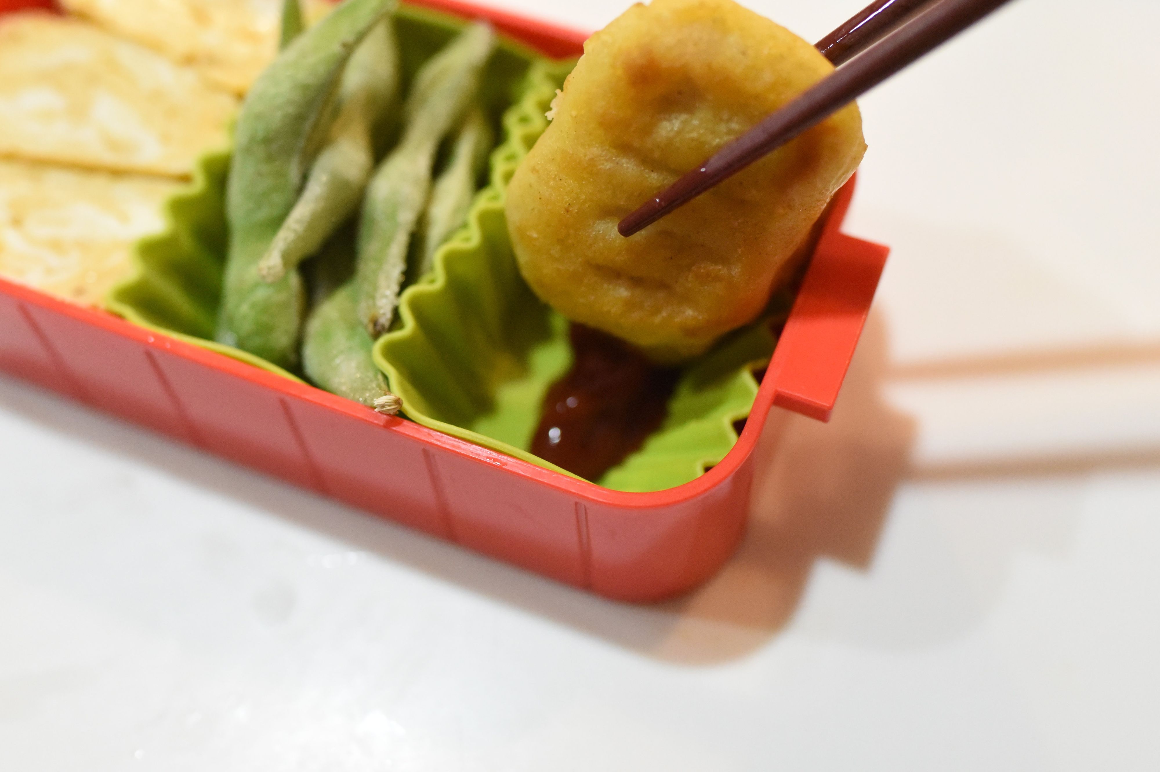 詰めるときは、先にカップにケチャップを入れてから「チキンナゲット」を入れると、まわりのおかずやふたにケチャップがつかないのでおすすめです。