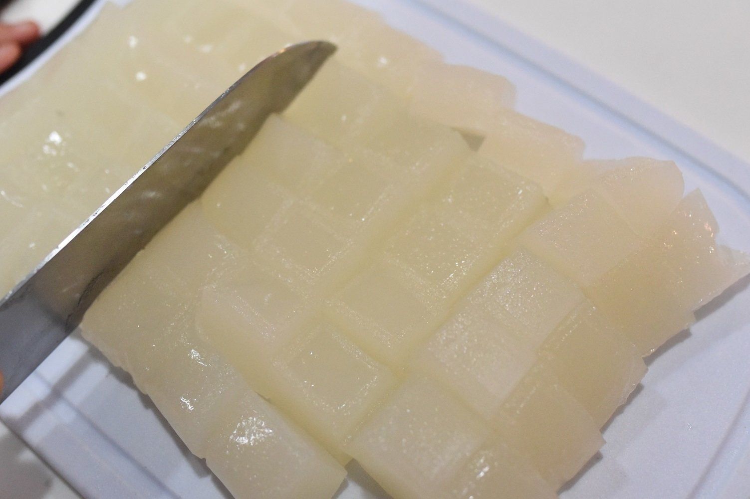 食べるときは、わらび餅を袋から出して、包丁で切ります。上の写真を撮ったときは、長いほうの辺を8等分、短いほうの辺を6等分に切りました。大人には食べ応えのあるサイズでよかったのですが、子どもの口には大きすぎたので、もう少し小さく切ることをおすすめします。