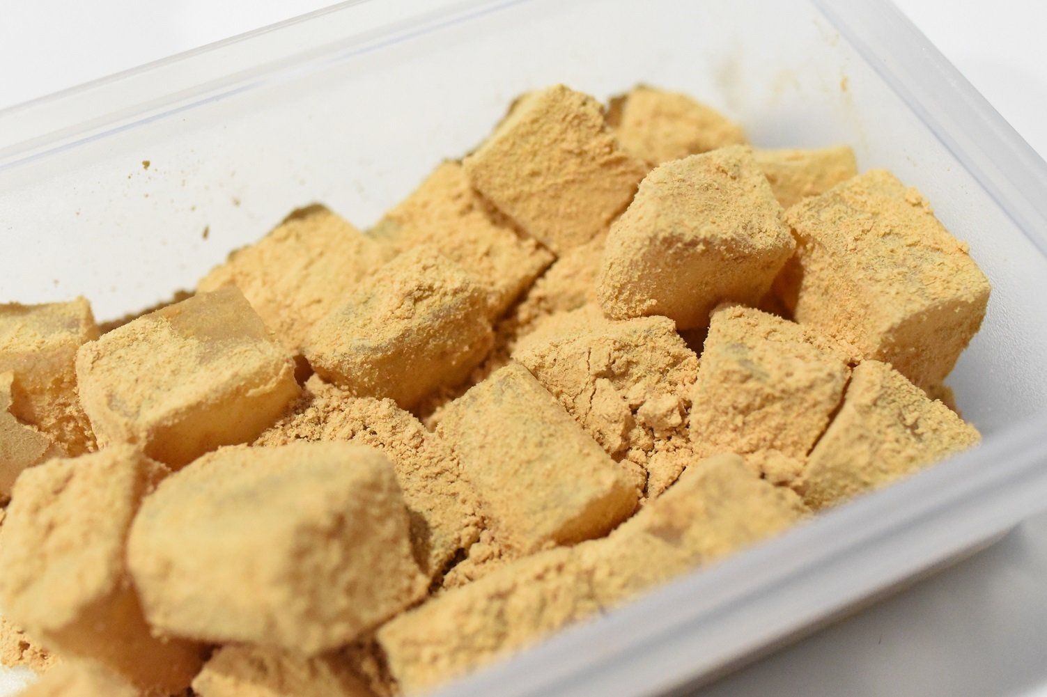 1回で食べきれなかったり、持ち寄りったりするときは、「きなこ」をからめてから保存容器に入れておきましょう。カットする手間が省けます。「黒みつ」は食べる直前にかけてくださいね。