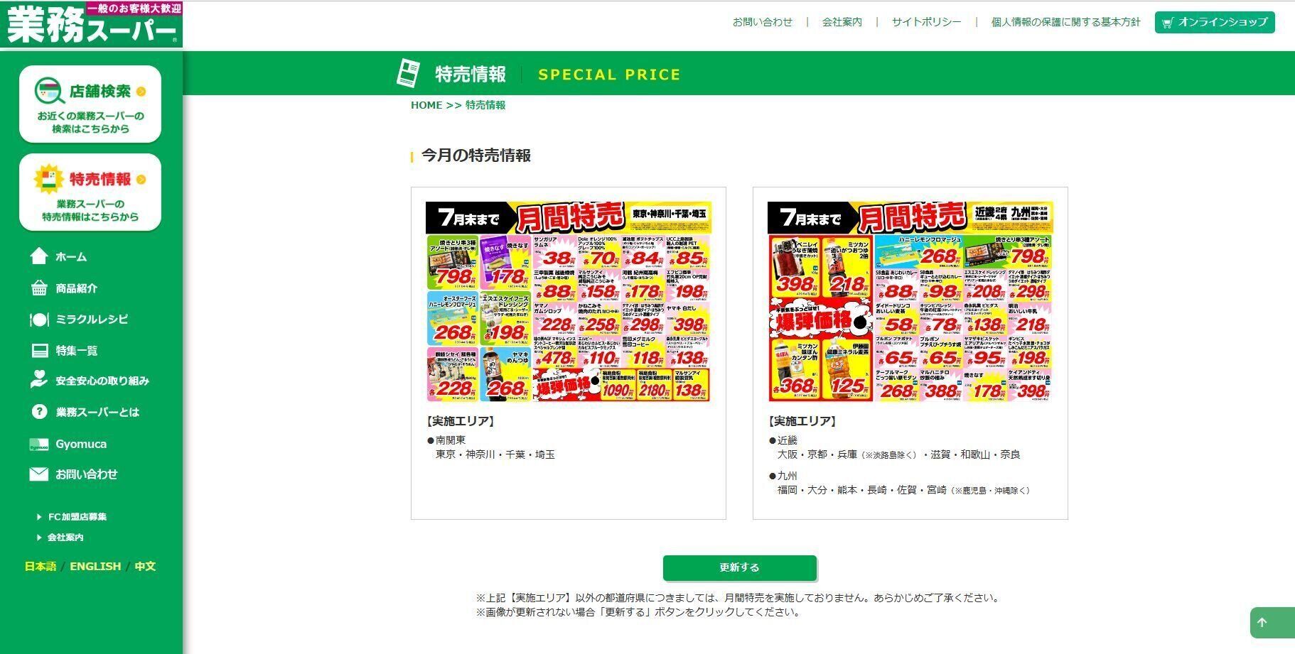 しかし、前述のとおり業務スーパーでは折り込みチラシをやっていません。では、どこでチェックできるのかというと……業務スーパーの公式サイトです!