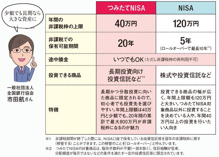 「非課税枠を設けることで、投資に対して不安や抵抗感がある人でも投資をしやすくなるようにと、14年に『NISA』が登場しました。そして今回、一度の投資に大金を使いたくない人や、長期的にコツコツ投資したい人向けに、新しく設けられたのが「つみたてNISA」です」と、全国銀行協会の市田さん。