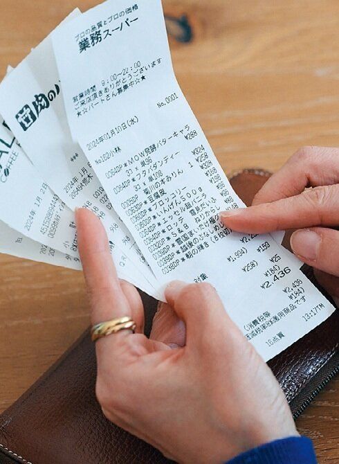 レシートを見ながら“ひとり反省会”をします。「現在、家計簿はつけていません。買った物と金額を見るだけでも次の買い物に反映されますよ」。