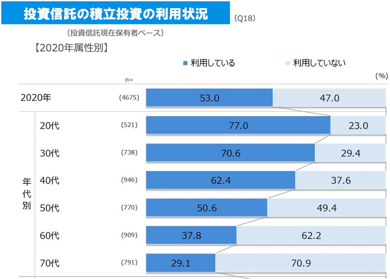 さらに、「投資信託」を保有している人の53.0%が積立投資をしていて、下記グラフの通り、若い人ほどその利用率が高くなっています。