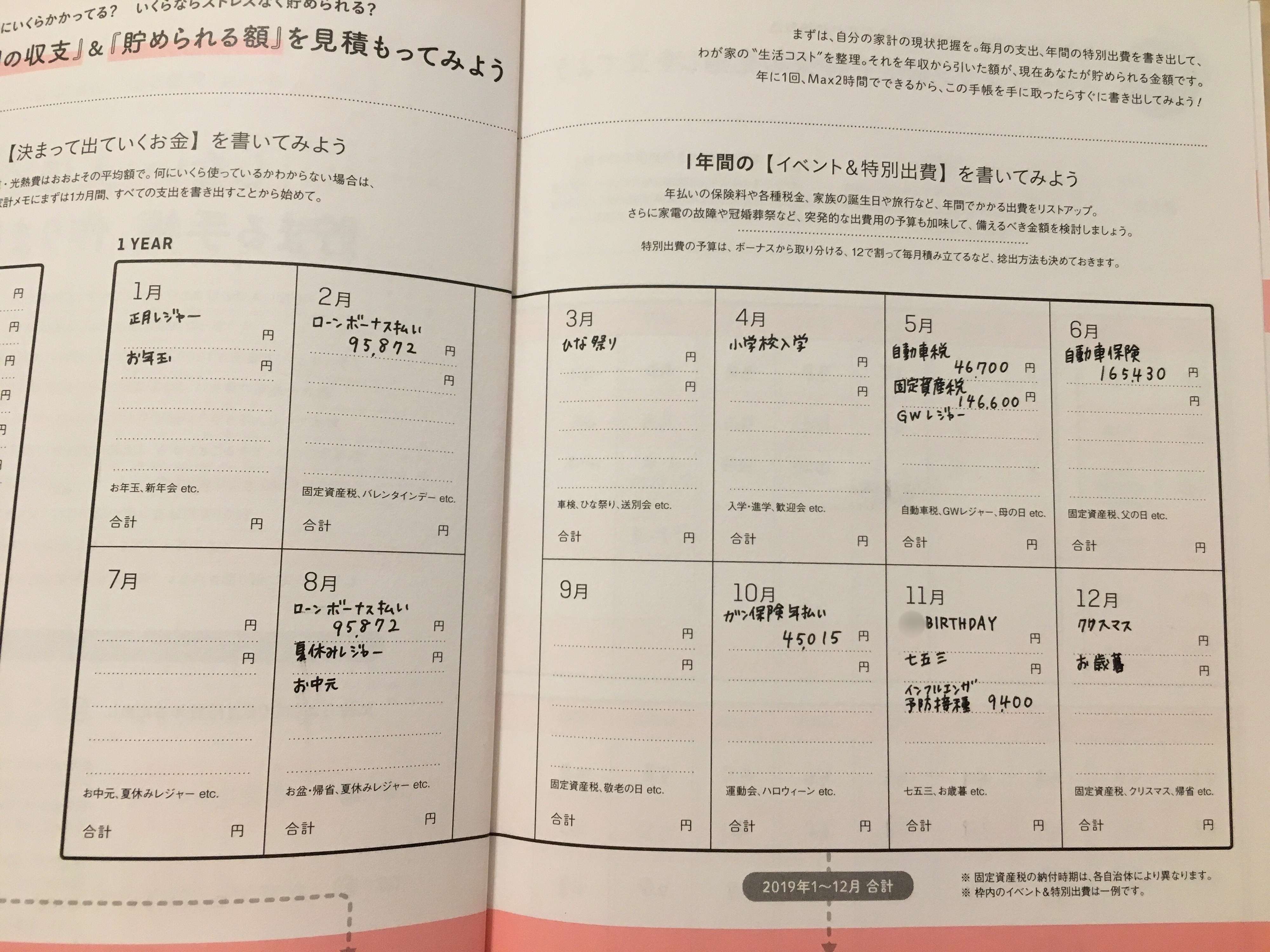 昨年140万円貯金したここゆきさんは、サンキュ!付録の家計簿を活用しています。とくに1年間のイベント&特別出費に書き込むんで、特別な出費にいくらかかるのかが一目でわかるように。お金の流れを把握することで、計画的にお金を使うことができるようです。