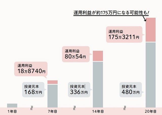 最初は少しずつしか殖えませんが、年月がたつほど利益が利益を生み、お金が殖えていく仕組み。「少額でも長期間継続すると、最終的な実りを大きくできます」(横山さん)