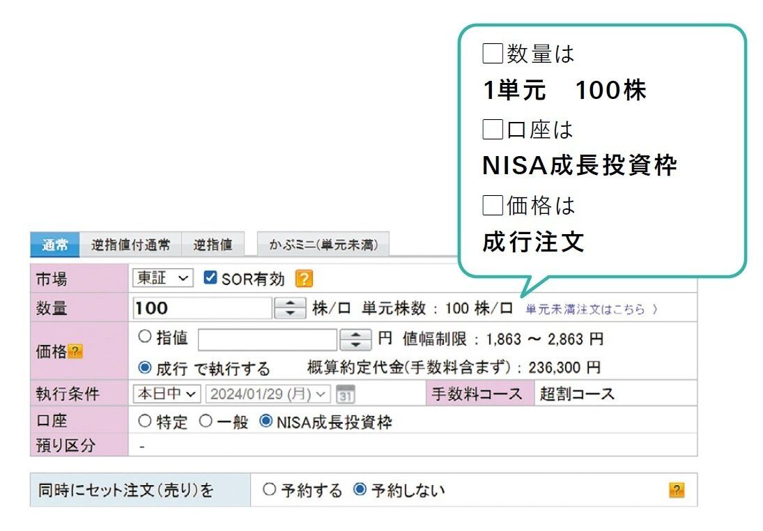 買いたい銘柄の取引ページにいき、取引は現物買い、数量は100株、口座はNISA成長投資枠、価格は成行を選べばOK。証券サイトにはわからない用語が並んでいるけれど、ここだけおさえれば意外と簡単!