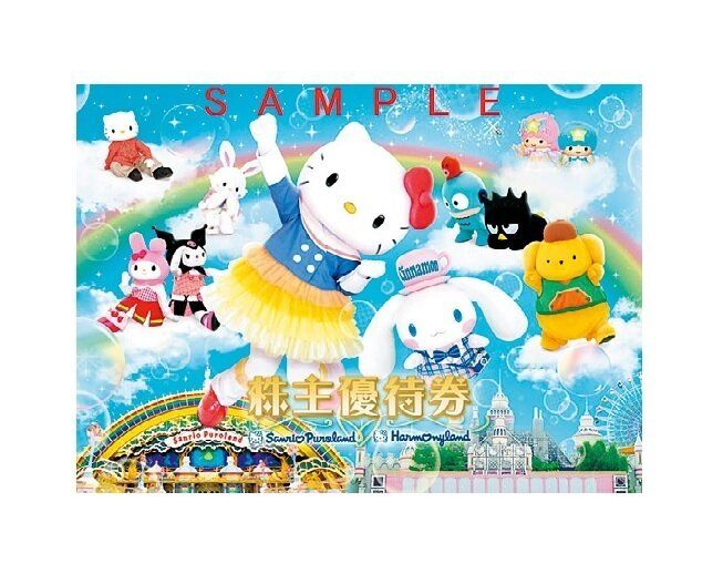 100株保有でサンリオピューロランド、ハーモニーランドの共通優待券3枚とサンリオショップで利用できる1000円割引券1枚がもらえます。
