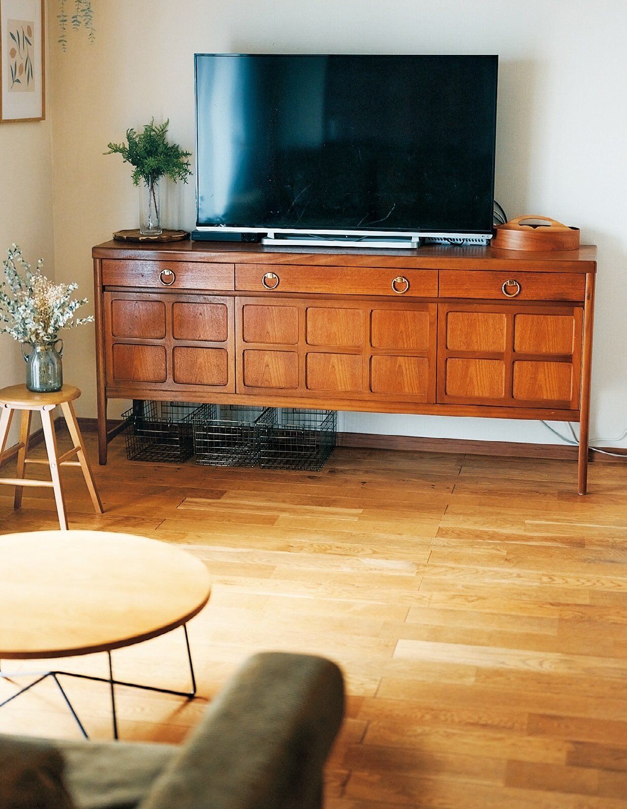 テレビボードは楽天市場のビンテージ家具店をマークし、スーパーセールのタイミングで購入。ポイントもお得にゲット!「コロナ禍で行けなかった家族旅行用の予算をあてました」。
