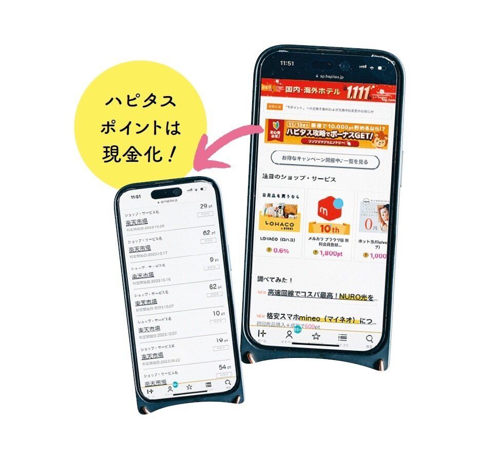 「ハピタス」は、提携ショップの買い物やサービス利用でハピタスポイントがたまる仕組み。「楽天市場の前にここを経由。ハピタスポイントは現金やほかのポイントに還元できます」。