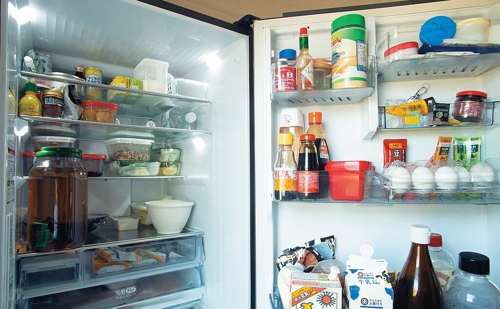 インスタでは「これマジいいよ!」とママ友に話す感覚で発信!(上)冷蔵庫はどこに何があるかパッとわかればざっくり収納でOK。(下)私が考案した「ストックあり」シール。「ストックがあるので買い足さなくてよし」と一目瞭然。