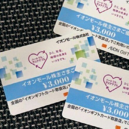 100株でイオンギフトカードが3,000円分もらえます。家族3名義分で9000円分。500円券や1000円券などおつりが出ない商品券は多いですが、イオンギフトカードは1円単位で支払えて超便利☆