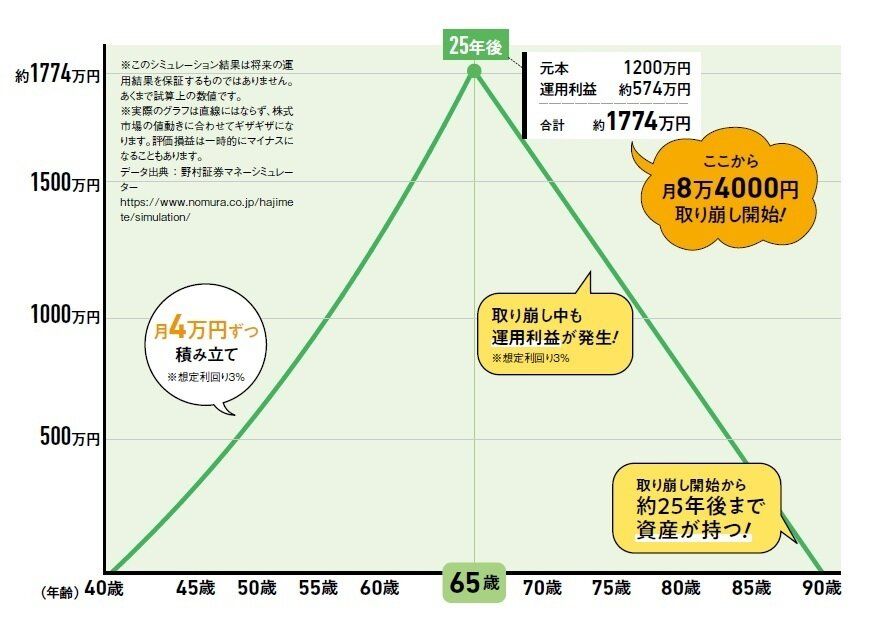 40歳から毎月4万円ずつ、利回り3%で運用した場合、25年で元本1200万円+運用利益約574万円で約1774万円に。これを元手にして、同じく3%で運用しながら取り崩すと、90歳までの25年間、毎月8万4000円が受け取れます。