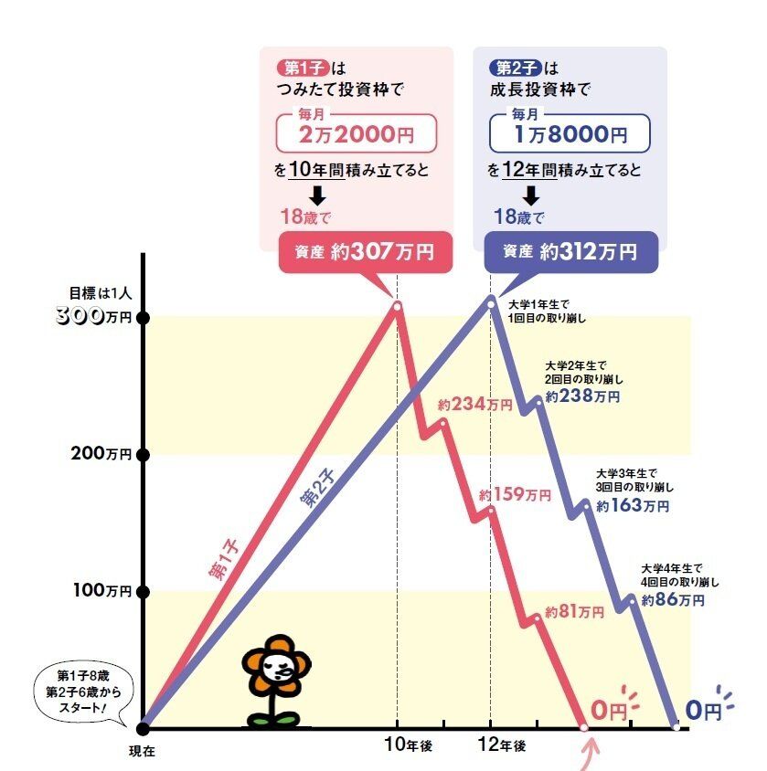 第1子が8歳から月2万2000円を積み立て投資した場合、10年目に積み立て総額264万円が約307万円に。第2子は投資期間が長い分、毎月の積み立て額は1万8000円と第1子より少なくてOK。大学進学後は、約4分の1ずつ4回に分けて取り崩して、4年間で使い切ります。