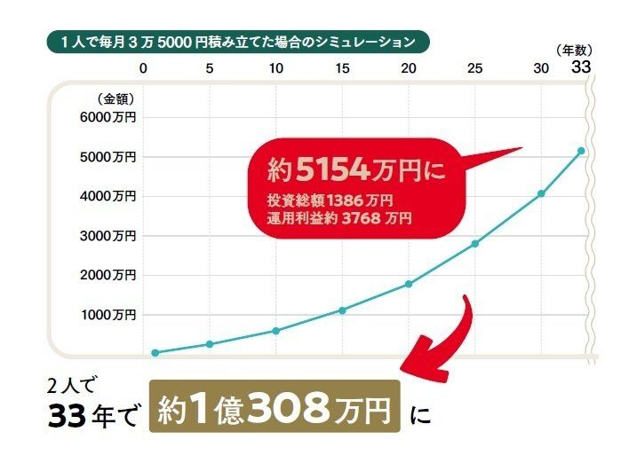 NISA口座を夫婦それぞれで作れば、非課税のメリットが受けられる投資額の上限(1人MAXで1800万円)も2倍に。夫婦合わせて月7万円の積み立て額なら無理がなく、20~30代の夫婦であれば33年かかっても老後まで充分余裕があります。
