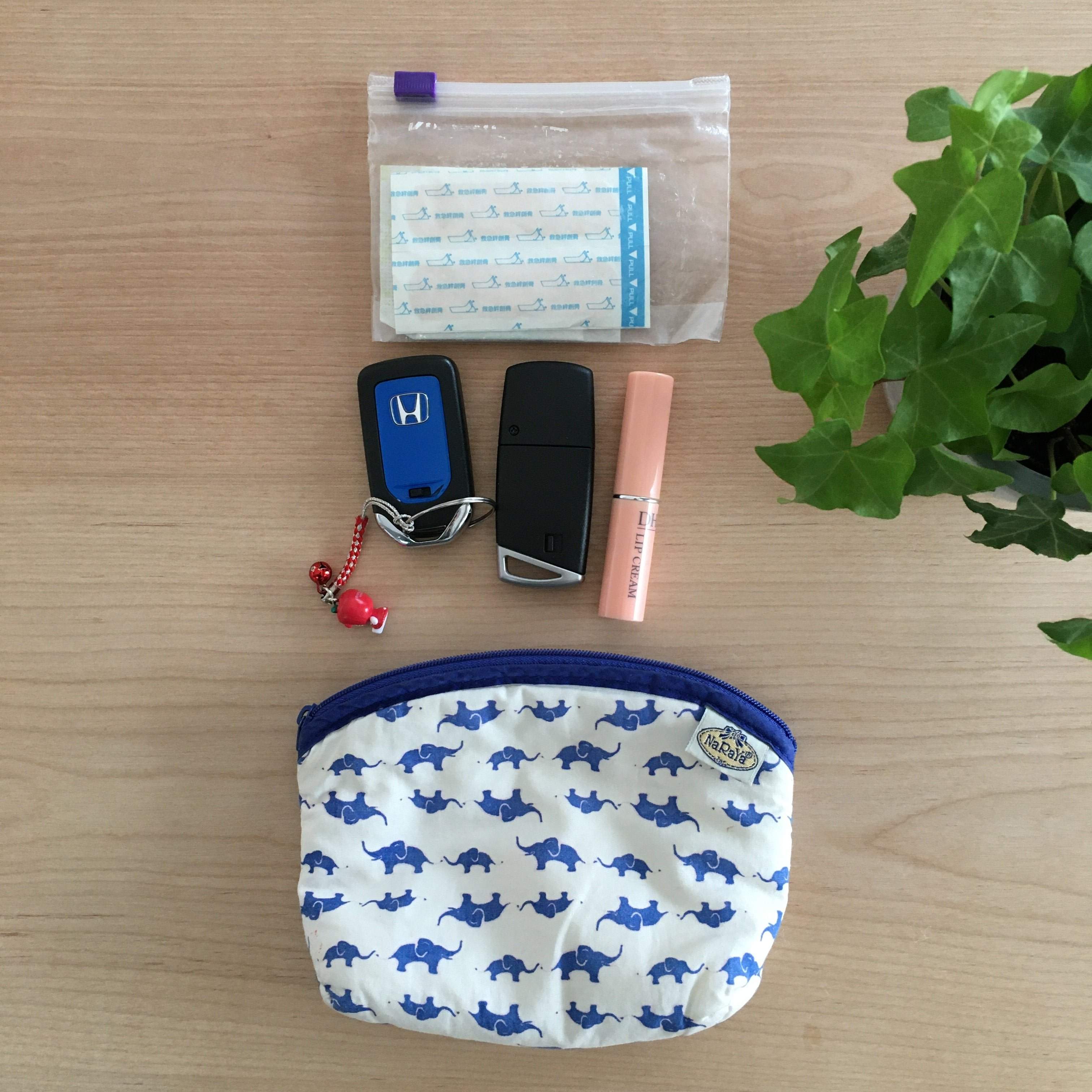 タイで買ったお気に入りのポーチの中には常備薬と鍵(家・車)、リップクリーム、絆創膏が入っています。浪費家だった頃は、化粧ポーチに化粧下地からファンデーション、アイメイク、チークなど化粧用品一式入れて持ち歩いていました。
