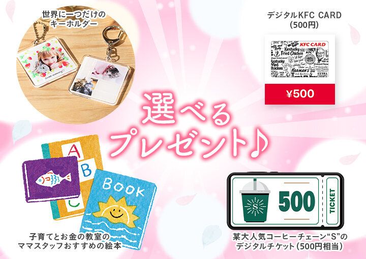 4月は、某大人気コーヒーチェーン“S”のデジタルチケット(500円)、デジタルKFC CARD(500円)、好きな写真が入れられる世界に一つだけのキーホルダー、子育てとお金の教室のママスタッフおすすめの絵本から選べます。