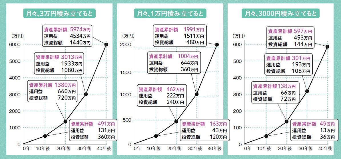 生活防衛費をすでに確保し、さらに投資でお金が殖えていくことが実感できたら、毎月の投資額を増やすのがおすすめ。40年間、月3000円を積み立てた場合の運用益は453万円ですが、月3万円なら10倍の4534万円に。