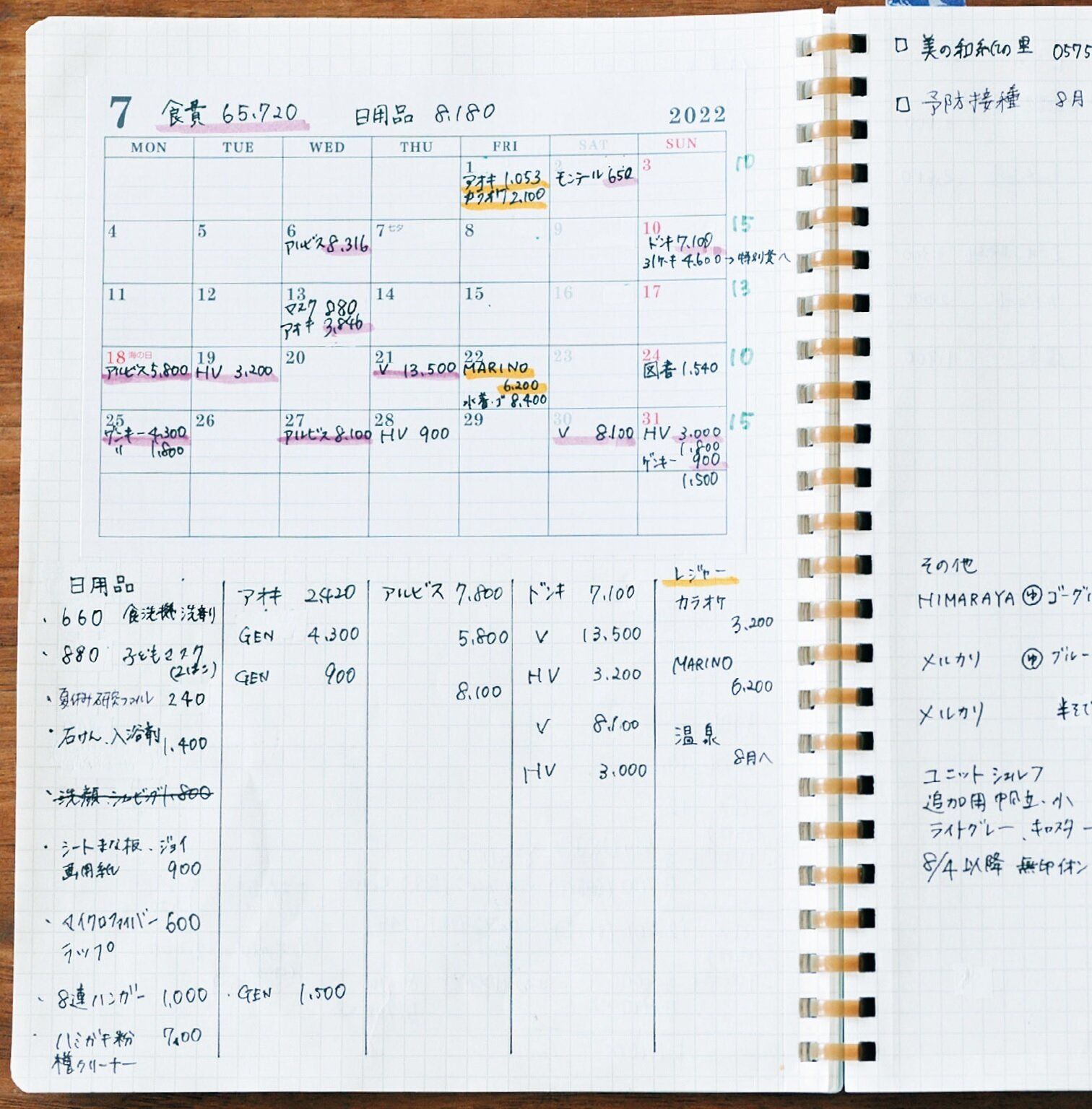 カレンダー部分に『食費』『日用品費』『レジャー費』の出費だけ記入。「買い物をしたら、店名と金額を書き、食費はピンク、レジャー費は黄色でマーカー。日用品費は下に商品名をメモして消費ペースの参考に。食費は店舗ごとの金額、レジャー費は内訳をざっくり書きます」。