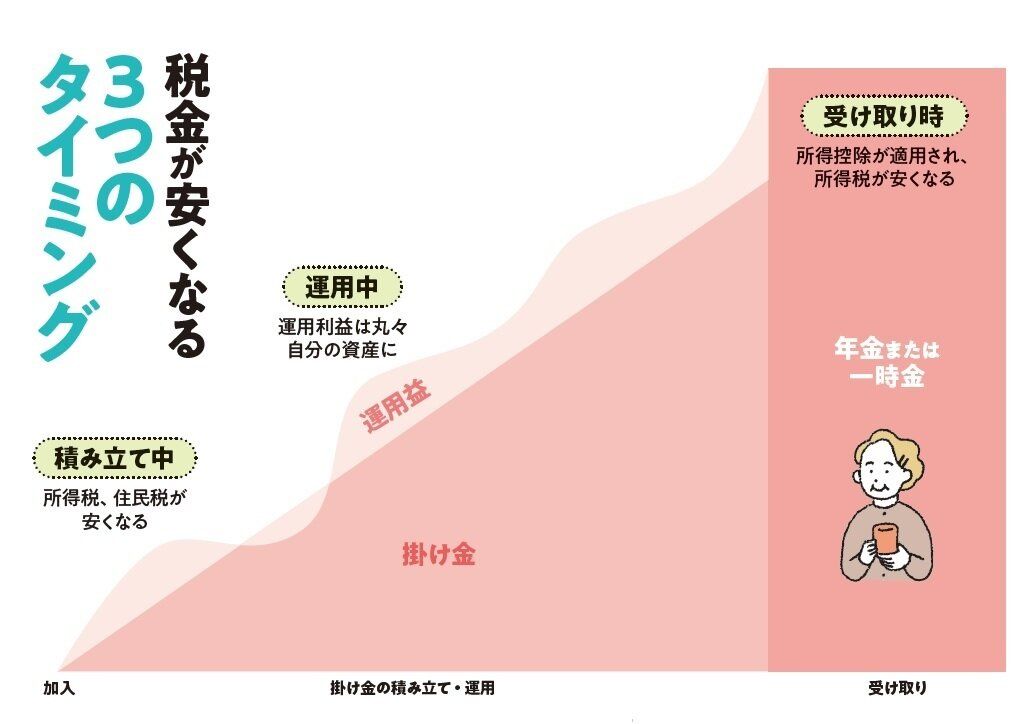 投資した金額は所得から全額控除でき、運用中に発生した利益は非課税に。受け取るときにも退職所得控除や公的年金等控除が適用され、一定額まで非課税となるので、節税のメリット大!「職業や収入、企業年金の有無によって掛け金の限度額は異なり、限度額が高い自営業は、控除できる金額もより多くなります。専業主婦(主夫)の場合、所得控除のメリットはありませんが、運用利益、受け取り時の節税は適用されます」。
